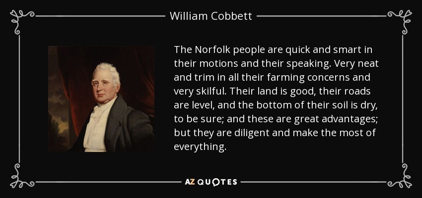 The Norfolk people are quick and smart in their motions and their speaking. Very neat and trim in all their farming concerns and very skilful. Their land is good, their roads are level, and the bottom of their soil is dry, to be sure; and these are great advantages; but they are diligent and make the most of everything.