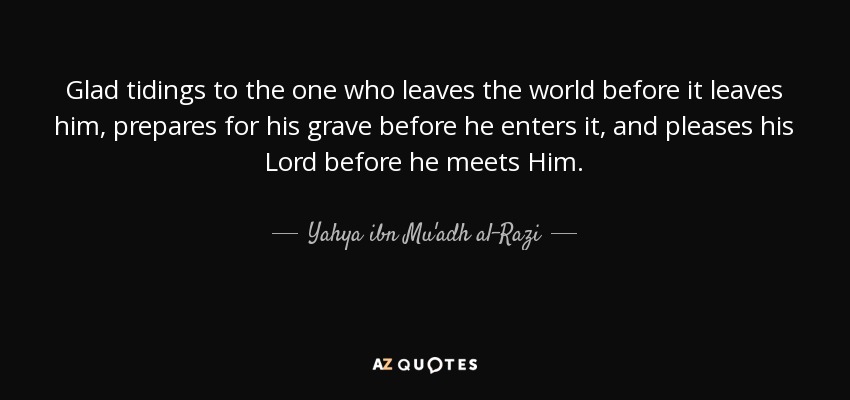 Glad tidings to the one who leaves the world before it leaves him, prepares for his grave before he enters it, and pleases his Lord before he meets Him.