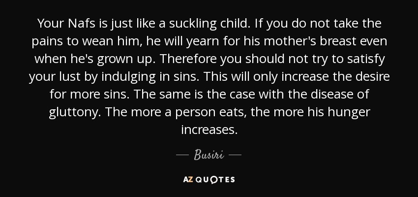 Your Nafs is just like a suckling child. If you do not take the pains to wean him, he will yearn for his mother's breast even when he's grown up. Therefore you should not try to satisfy your lust by indulging in sins. This will only increase the desire for more sins. The same is the case with the disease of gluttony. The more a person eats, the more his hunger increases.