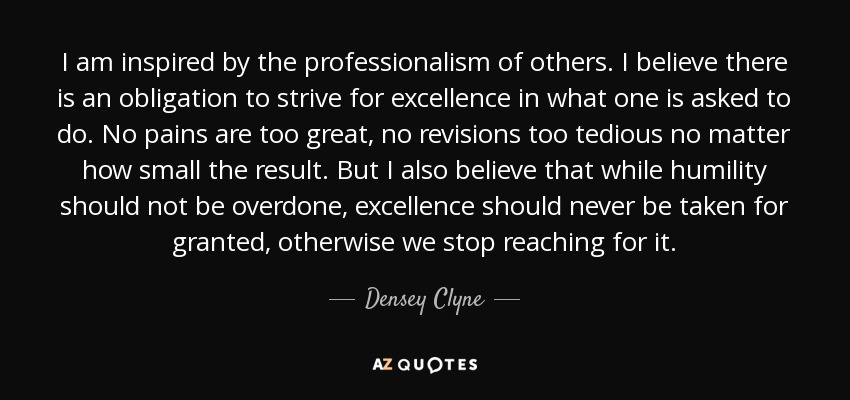 I am inspired by the professionalism of others. I believe there is an obligation to strive for excellence in what one is asked to do. No pains are too great, no revisions too tedious no matter how small the result. But I also believe that while humility should not be overdone, excellence should never be taken for granted, otherwise we stop reaching for it.