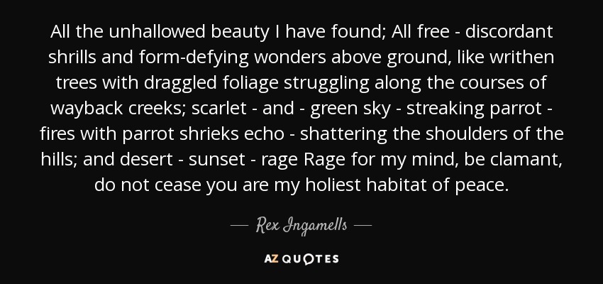All the unhallowed beauty I have found; All free - discordant shrills and form-defying wonders above ground, like writhen trees with draggled foliage struggling along the courses of wayback creeks; scarlet - and - green sky - streaking parrot - fires with parrot shrieks echo - shattering the shoulders of the hills; and desert - sunset - rage Rage for my mind, be clamant, do not cease you are my holiest habitat of peace.