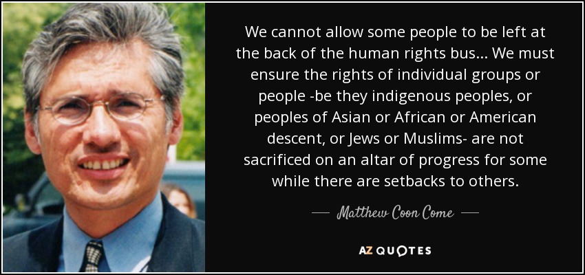 We cannot allow some people to be left at the back of the human rights bus... We must ensure the rights of individual groups or people -be they indigenous peoples, or peoples of Asian or African or American descent, or Jews or Muslims- are not sacrificed on an altar of progress for some while there are setbacks to others.