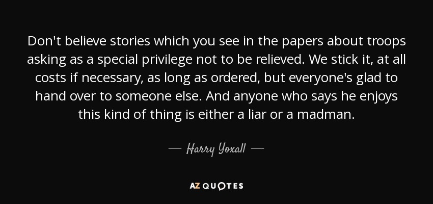Don't believe stories which you see in the papers about troops asking as a special privilege not to be relieved. We stick it, at all costs if necessary, as long as ordered, but everyone's glad to hand over to someone else. And anyone who says he enjoys this kind of thing is either a liar or a madman.