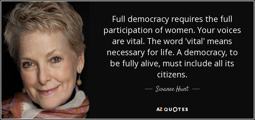 Full democracy requires the full participation of women. Your voices are vital. The word 'vital' means necessary for life. A democracy, to be fully alive, must include all its citizens.