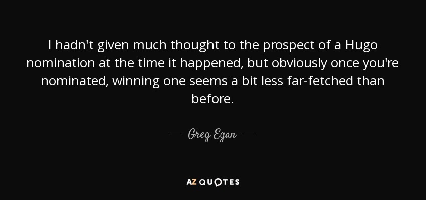 I hadn't given much thought to the prospect of a Hugo nomination at the time it happened, but obviously once you're nominated, winning one seems a bit less far-fetched than before.