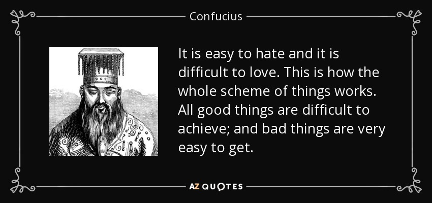 It is easy to hate and it is difficult to love. This is how the whole scheme of things works. All good things are difficult to achieve; and bad things are very easy to get.