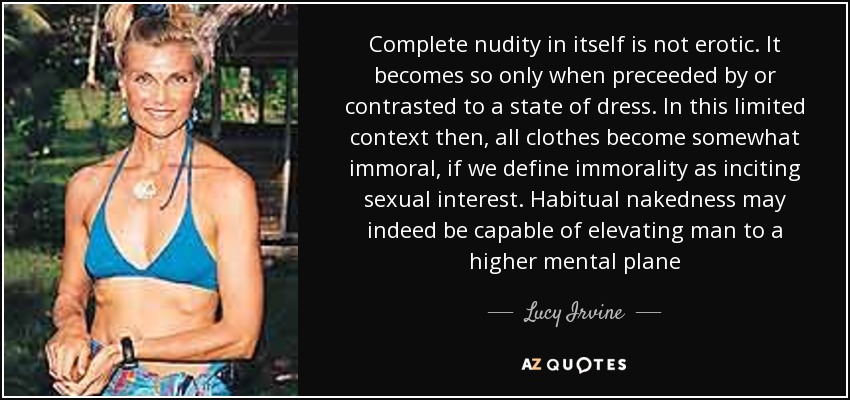 Complete nudity in itself is not erotic. It becomes so only when preceeded by or contrasted to a state of dress. In this limited context then, all clothes become somewhat immoral, if we define immorality as inciting sexual interest. Habitual nakedness may indeed be capable of elevating man to a higher mental plane