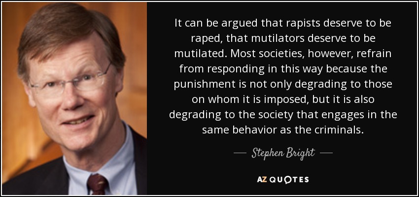 It can be argued that rapists deserve to be raped, that mutilators deserve to be mutilated. Most societies, however, refrain from responding in this way because the punishment is not only degrading to those on whom it is imposed, but it is also degrading to the society that engages in the same behavior as the criminals.