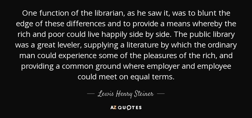 One function of the librarian, as he saw it, was to blunt the edge of these differences and to provide a means whereby the rich and poor could live happily side by side. The public library was a great leveler, supplying a literature by which the ordinary man could experience some of the pleasures of the rich, and providing a common ground where employer and employee could meet on equal terms.