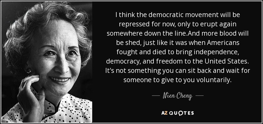 I think the democratic movement will be repressed for now, only to erupt again somewhere down the line.And more blood will be shed, just like it was when Americans fought and died to bring independence, democracy, and freedom to the United States. It's not something you can sit back and wait for someone to give to you voluntarily.