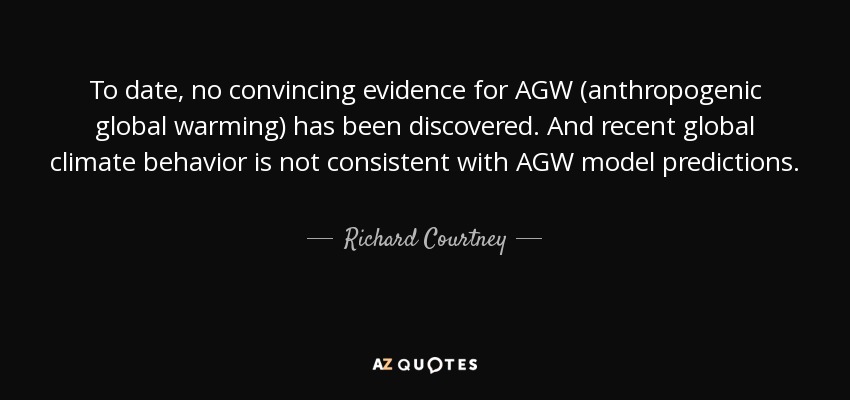 To date, no convincing evidence for AGW (anthropogenic global warming) has been discovered. And recent global climate behavior is not consistent with AGW model predictions.