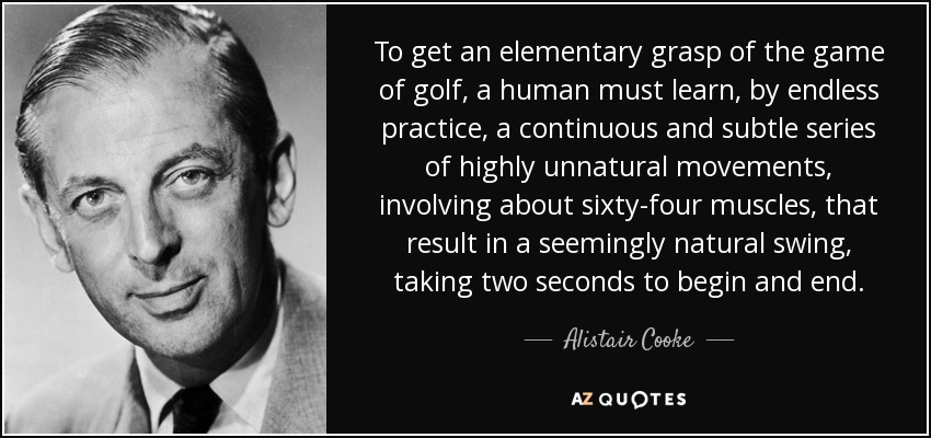 To get an elementary grasp of the game of golf, a human must learn, by endless practice, a continuous and subtle series of highly unnatural movements, involving about sixty-four muscles, that result in a seemingly natural swing, taking two seconds to begin and end.