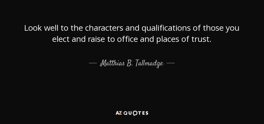 Look well to the characters and qualifications of those you elect and raise to office and places of trust.