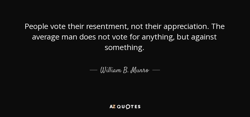 People vote their resentment, not their appreciation. The average man does not vote for anything, but against something.