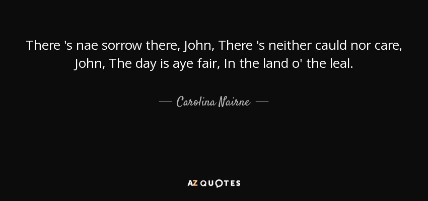 There 's nae sorrow there, John, There 's neither cauld nor care, John, The day is aye fair, In the land o' the leal.