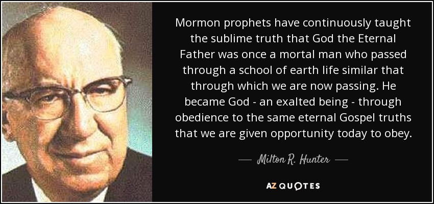 Mormon prophets have continuously taught the sublime truth that God the Eternal Father was once a mortal man who passed through a school of earth life similar that through which we are now passing. He became God - an exalted being - through obedience to the same eternal Gospel truths that we are given opportunity today to obey.
