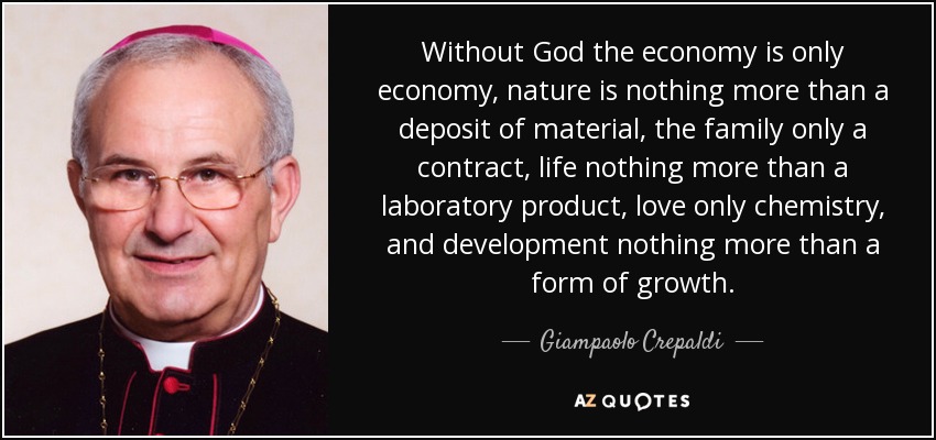 Without God the economy is only economy, nature is nothing more than a deposit of material, the family only a contract, life nothing more than a laboratory product, love only chemistry, and development nothing more than a form of growth.