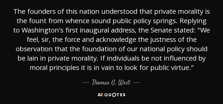The founders of this nation understood that private morality is the fount from whence sound public policy springs. Replying to Washington's first inaugural address, the Senate stated: "We feel, sir, the force and acknowledge the justness of the observation that the foundation of our national policy should be lain in private morality. If individuals be not influenced by moral principles it is in vain to look for public virtue."