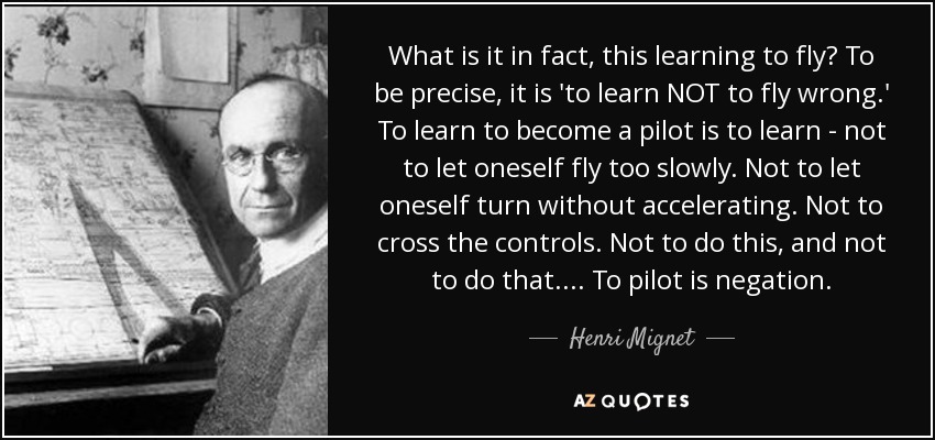What is it in fact, this learning to fly? To be precise, it is 'to learn NOT to fly wrong.' To learn to become a pilot is to learn - not to let oneself fly too slowly. Not to let oneself turn without accelerating. Not to cross the controls. Not to do this, and not to do that. . . . To pilot is negation.