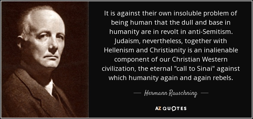 It is against their own insoluble problem of being human that the dull and base in humanity are in revolt in anti-Semitism. Judaism, nevertheless, together with Hellenism and Christianity is an inalienable component of our Christian Western civilization, the eternal "call to Sinai" against which humanity again and again rebels.