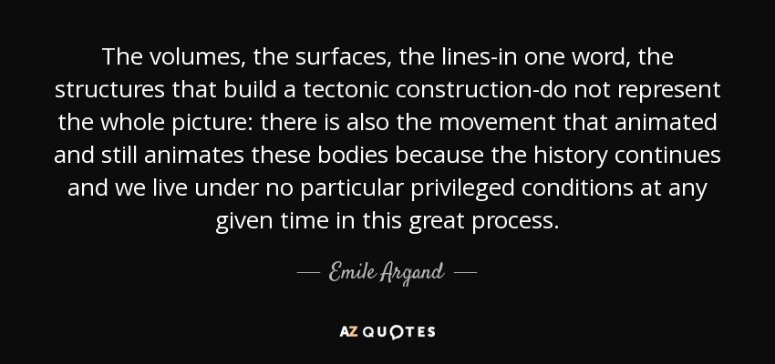 The volumes, the surfaces, the lines-in one word, the structures that build a tectonic construction-do not represent the whole picture: there is also the movement that animated and still animates these bodies because the history continues and we live under no particular privileged conditions at any given time in this great process.
