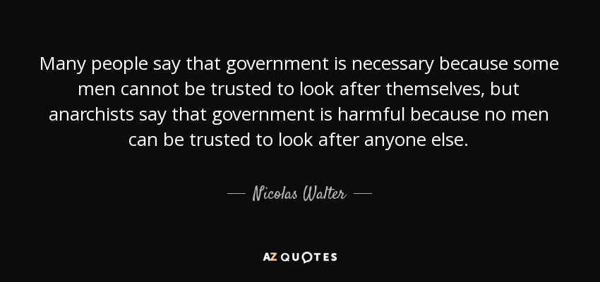 Many people say that government is necessary because some men cannot be trusted to look after themselves, but anarchists say that government is harmful because no men can be trusted to look after anyone else.