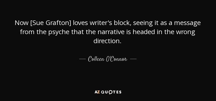 Now [Sue Grafton] loves writer's block, seeing it as a message from the psyche that the narrative is headed in the wrong direction.