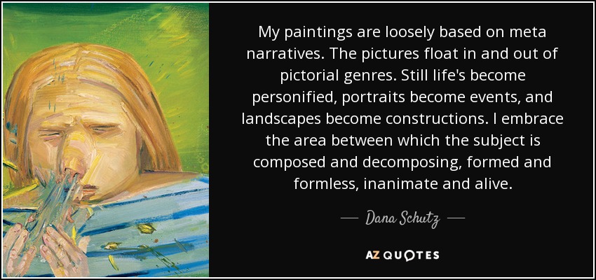 My paintings are loosely based on meta narratives. The pictures float in and out of pictorial genres. Still life's become personified, portraits become events, and landscapes become constructions. I embrace the area between which the subject is composed and decomposing, formed and formless, inanimate and alive.