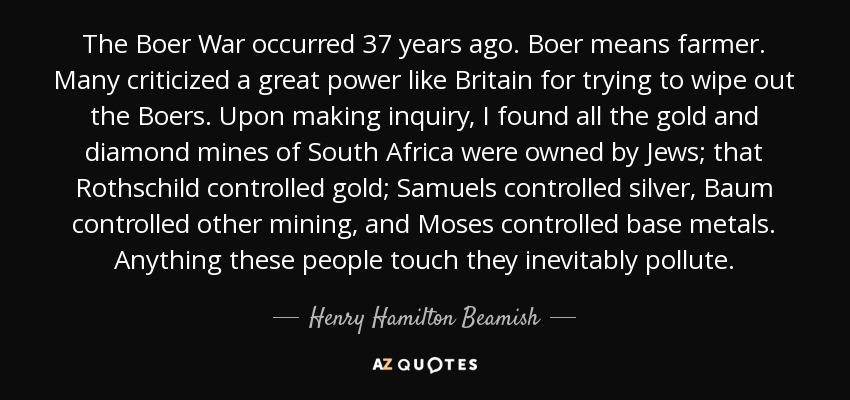 The Boer War occurred 37 years ago. Boer means farmer. Many criticized a great power like Britain for trying to wipe out the Boers. Upon making inquiry, I found all the gold and diamond mines of South Africa were owned by Jews; that Rothschild controlled gold; Samuels controlled silver, Baum controlled other mining, and Moses controlled base metals. Anything these people touch they inevitably pollute.