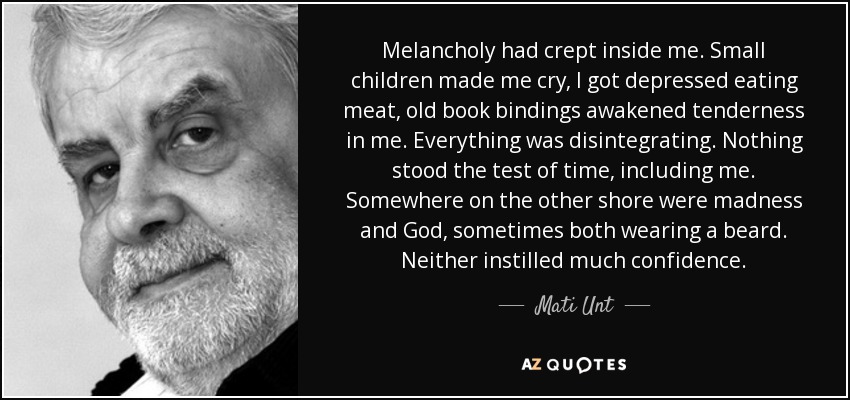 Melancholy had crept inside me. Small children made me cry, I got depressed eating meat, old book bindings awakened tenderness in me. Everything was disintegrating. Nothing stood the test of time, including me. Somewhere on the other shore were madness and God, sometimes both wearing a beard. Neither instilled much confidence.