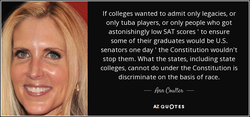 If colleges wanted to admit only legacies, or only tuba players, or only people who got astonishingly low SAT scores ' to ensure some of their graduates would be U.S. senators one day ' the Constitution wouldn't stop them. What the states, including state colleges, cannot do under the Constitution is discriminate on the basis of race.