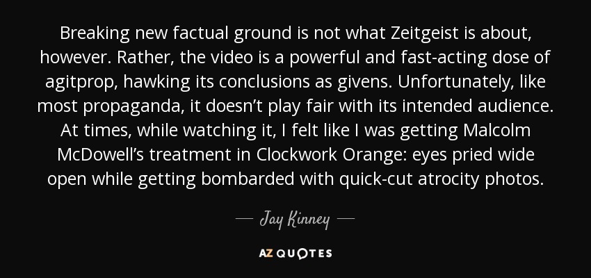 Breaking new factual ground is not what Zeitgeist is about, however. Rather, the video is a powerful and fast-acting dose of agitprop, hawking its conclusions as givens. Unfortunately, like most propaganda, it doesn’t play fair with its intended audience. At times, while watching it, I felt like I was getting Malcolm McDowell’s treatment in Clockwork Orange: eyes pried wide open while getting bombarded with quick-cut atrocity photos.