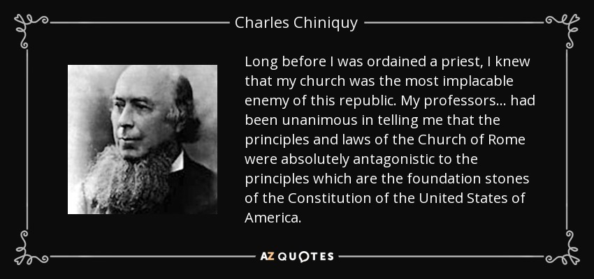 Long before I was ordained a priest, I knew that my church was the most implacable enemy of this republic. My professors ... had been unanimous in telling me that the principles and laws of the Church of Rome were absolutely antagonistic to the principles which are the foundation stones of the Constitution of the United States of America.
