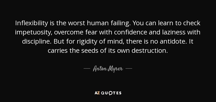 Inflexibility is the worst human failing. You can learn to check impetuosity, overcome fear with confidence and laziness with discipline. But for rigidity of mind, there is no antidote. It carries the seeds of its own destruction.