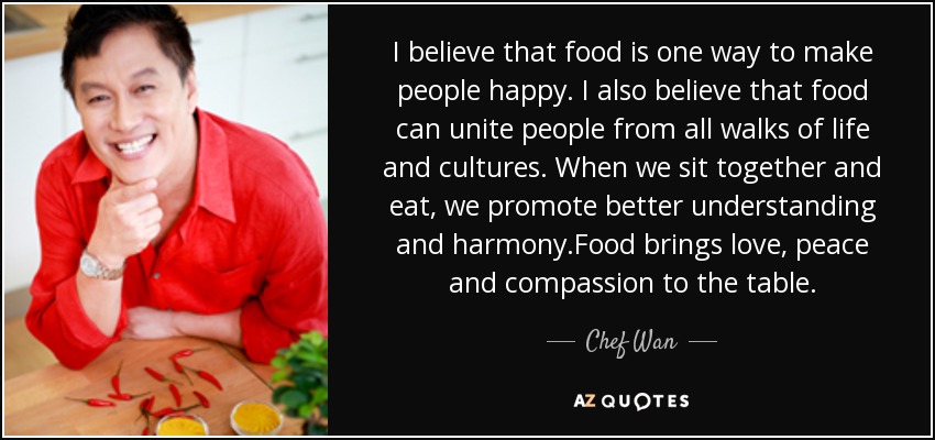 I believe that food is one way to make people happy. I also believe that food can unite people from all walks of life and cultures. When we sit together and eat, we promote better understanding and harmony.Food brings love, peace and compassion to the table.