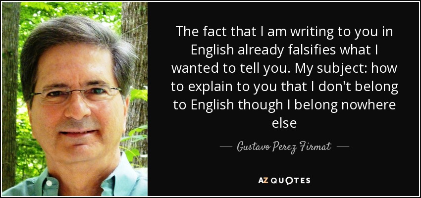 The fact that I am writing to you in English already falsifies what I wanted to tell you. My subject: how to explain to you that I don't belong to English though I belong nowhere else