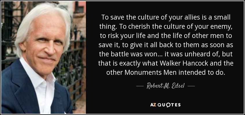 To save the culture of your allies is a small thing. To cherish the culture of your enemy, to risk your life and the life of other men to save it, to give it all back to them as soon as the battle was won… it was unheard of, but that is exactly what Walker Hancock and the other Monuments Men intended to do.
