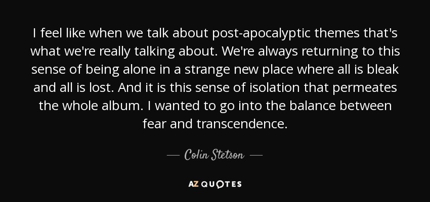 I feel like when we talk about post-apocalyptic themes that's what we're really talking about. We're always returning to this sense of being alone in a strange new place where all is bleak and all is lost. And it is this sense of isolation that permeates the whole album. I wanted to go into the balance between fear and transcendence.