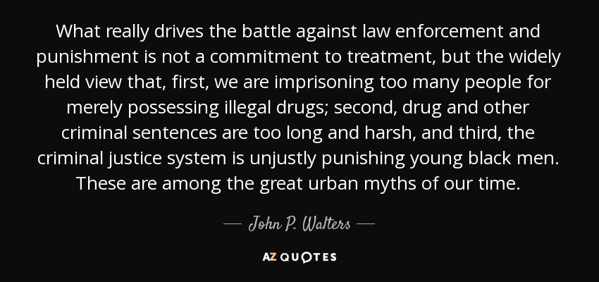 What really drives the battle against law enforcement and punishment is not a commitment to treatment, but the widely held view that, first, we are imprisoning too many people for merely possessing illegal drugs; second, drug and other criminal sentences are too long and harsh, and third, the criminal justice system is unjustly punishing young black men. These are among the great urban myths of our time.