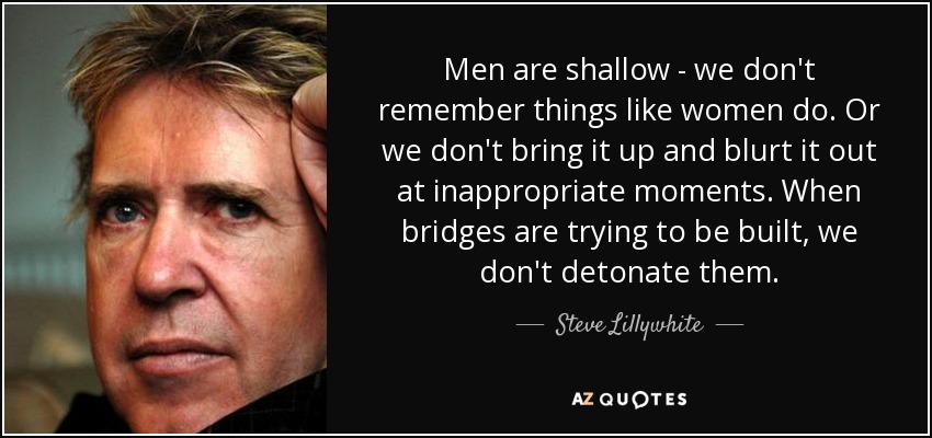 Men are shallow - we don't remember things like women do. Or we don't bring it up and blurt it out at inappropriate moments. When bridges are trying to be built, we don't detonate them.