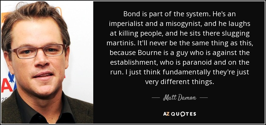 Bond is part of the system. He's an imperialist and a misogynist, and he laughs at killing people, and he sits there slugging martinis. It'll never be the same thing as this, because Bourne is a guy who is against the establishment, who is paranoid and on the run. I just think fundamentally they're just very different things.