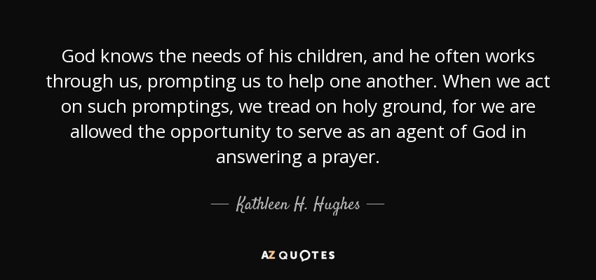 God knows the needs of his children, and he often works through us, prompting us to help one another. When we act on such promptings, we tread on holy ground, for we are allowed the opportunity to serve as an agent of God in answering a prayer.