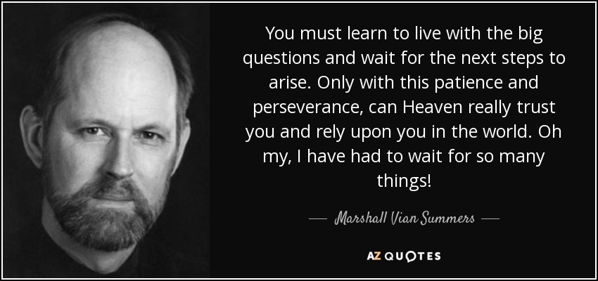You must learn to live with the big questions and wait for the next steps to arise. Only with this patience and perseverance, can Heaven really trust you and rely upon you in the world. Oh my, I have had to wait for so many things!