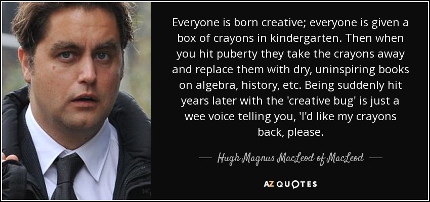 Everyone is born creative; everyone is given a box of crayons in kindergarten. Then when you hit puberty they take the crayons away and replace them with dry, uninspiring books on algebra, history, etc. Being suddenly hit years later with the 'creative bug' is just a wee voice telling you, 'I'd like my crayons back, please.