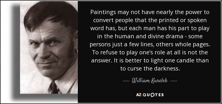 Paintings may not have nearly the power to convert people that the printed or spoken word has, but each man has his part to play in the human and divine drama - some persons just a few lines, others whole pages. To refuse to play one's role at all is not the answer. It is better to light one candle than to curse the darkness.