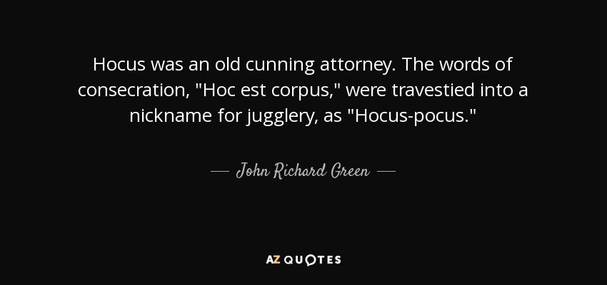Hocus was an old cunning attorney. The words of consecration, "Hoc est corpus," were travestied into a nickname for jugglery, as "Hocus-pocus."