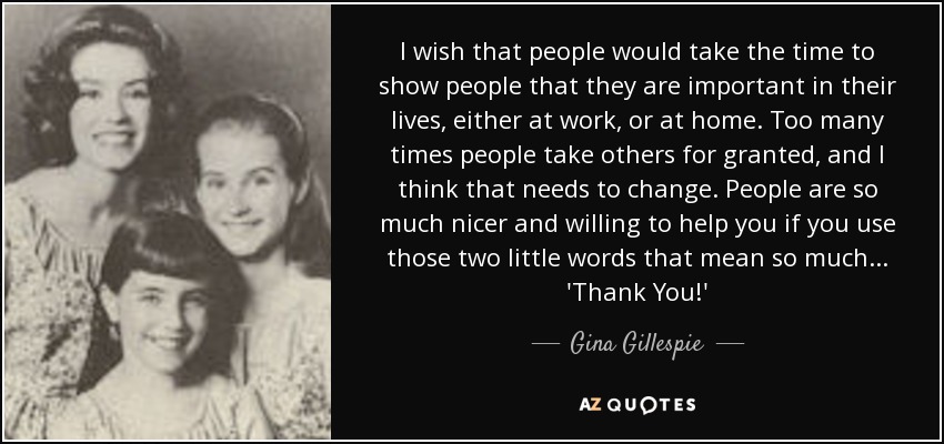 I wish that people would take the time to show people that they are important in their lives, either at work, or at home. Too many times people take others for granted, and I think that needs to change. People are so much nicer and willing to help you if you use those two little words that mean so much . . . 'Thank You!'