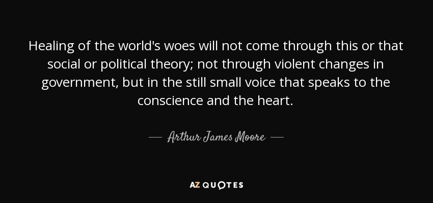 Healing of the world's woes will not come through this or that social or political theory; not through violent changes in government, but in the still small voice that speaks to the conscience and the heart.