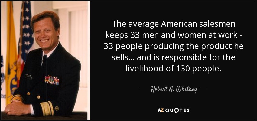 The average American salesmen keeps 33 men and women at work - 33 people producing the product he sells . . . and is responsible for the livelihood of 130 people.