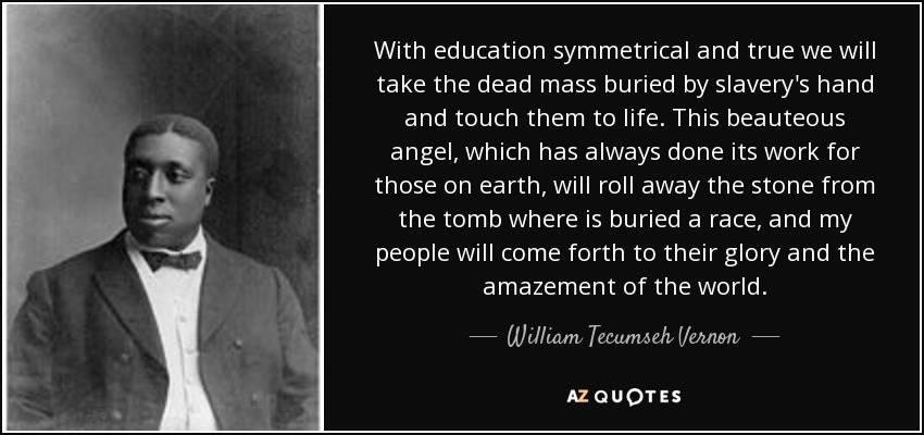 With education symmetrical and true we will take the dead mass buried by slavery's hand and touch them to life. This beauteous angel, which has always done its work for those on earth, will roll away the stone from the tomb where is buried a race, and my people will come forth to their glory and the amazement of the world.